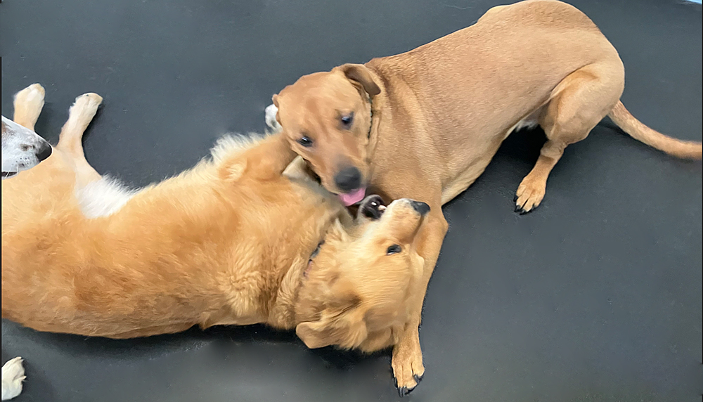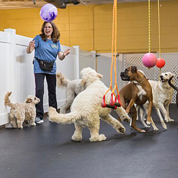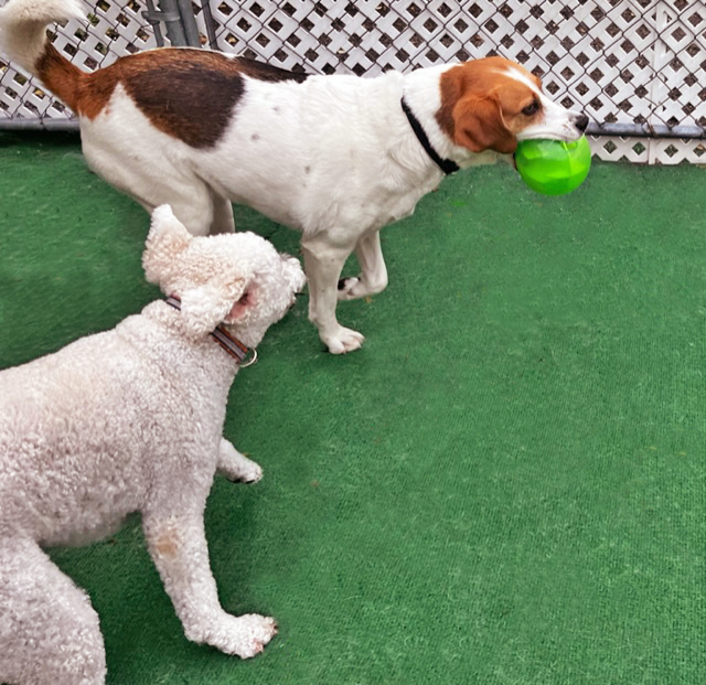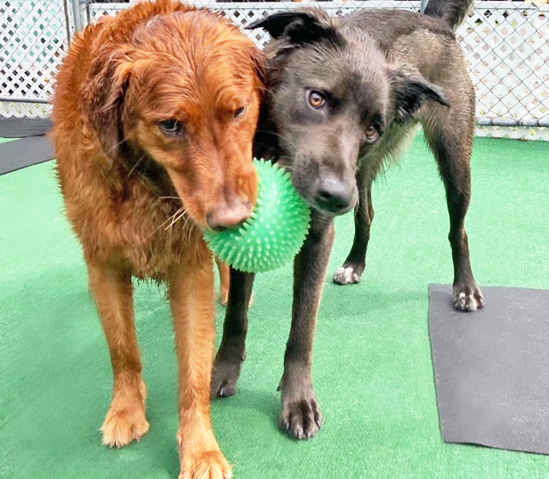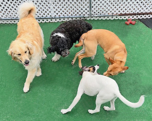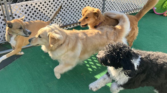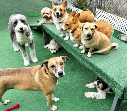 Our 6 safe, separate, supervised and sanitary dog playspaces cover 4,000+ square feet and include an 850 square foot outdoor run with play structures and tetherball. Partially shaded in the warmer months, this space is enjoyed year round by all of our furry friends.